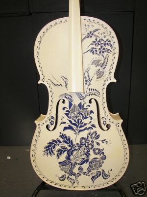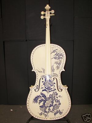 Modesto Artist: This cello, designed by Judy Johnson-Williams, is a painted off-white and blue floral design. Judy Johnson-Williams is an active artist whose work has been on display throughout the Western United States and Alaska. Recent showings include the International Gallery in Anchorage, AK, the Enso Gallery in Half Moon Bay, and the Charleston Heights Art Center in Las Vegas, NV. Her cello is a tribute to the hard-working musicians of smaller orchestras, and is titled "Music Folks." Phone 650-726-0804