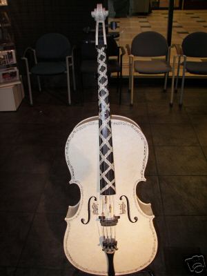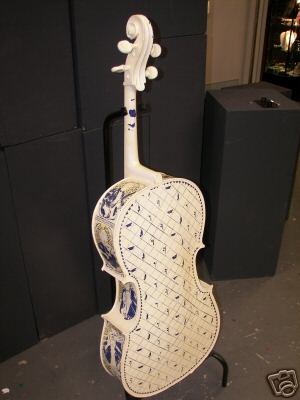 Modesto Artist: Donald Rowe, is painted an off-white and has borders of music staves on the front. The back features crisscrossing music staves. Roanld Rowe has worked with a wide variety of media throughout his life. He often experiments with combinations of media such as wood, metal, and paint. Mr. Rowe's cello is based on the story of a small violin that dreams to be a part of a large orchestra, and becomes a cello to do so. To contact the artist, his telephone is 209-551-1208.