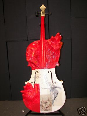 Modesto Artist: designed by Steve Mudge, has gold, metal flames affixed to the front and back. Steve Mudge has extensive experience working with metal shaping. He uses a plasma torch to create shapes and light reflections in metal. His cello, titled "phoenix Vibrations," is inspired by the warmth and passion of music. Phone: 209-526-6272.