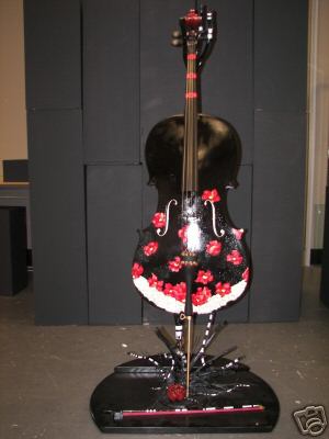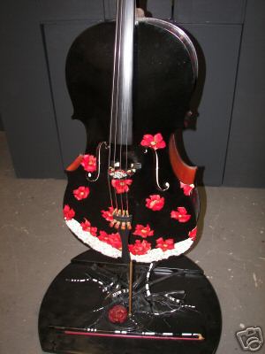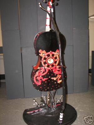 Modesto Aritst: This cello, designed by Sterling Parker, is painted black with red flowers on the lower half. The cello is supported by a specially designed tree branch stand that has been painted black.
