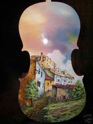 Modesto Artist: Claudette Bryant Garcia, is painted with a floral design on the front and a meadow with homes on the back side of the cello. Glaudette Bryant Garcia has taught art in the Central Valley for sixteen years. She is active in many mediums, and is acclaimed for her courses in watercolors, oils, and acrylics. Her cello is titled "French Village," is based on her love for rich landscapes. Phone: 209-830-1627