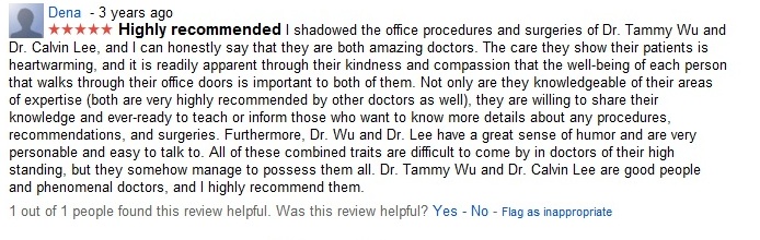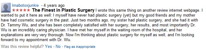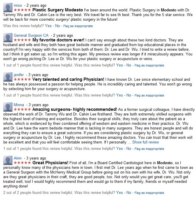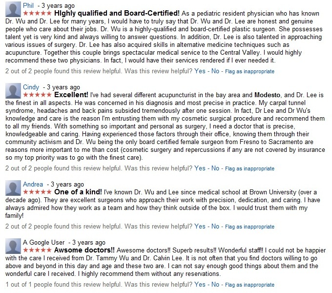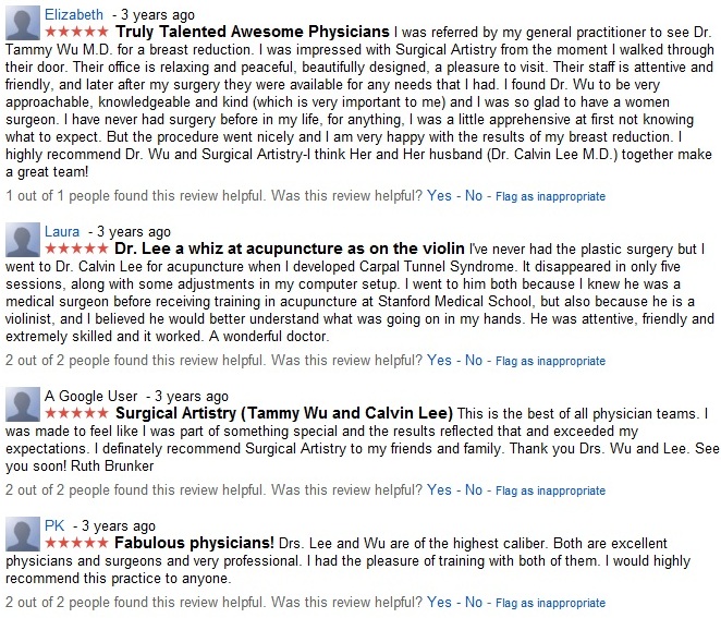 I think the reason for that is I keep trying to change the name of the business from Tzuying Tammy Wu, MD to Surgical Artistry and each time I change the business name, the reviews disappear. These are the reviews listed under Tzuying Tammy Wu, MD Inc.